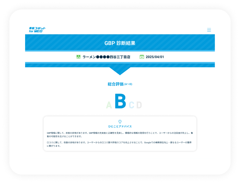 この無料診断ツールでは、あなたの店舗のGBP運用状況を分析し、